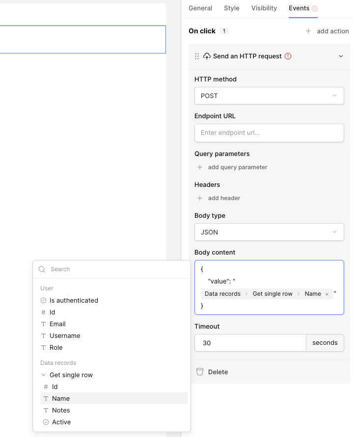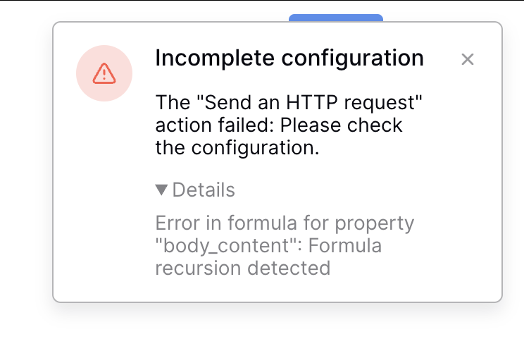 Is there a way to add in custom values from baserow into the body content of an http request ? I keep getting a recursive error, even though I am only pulling a single record.