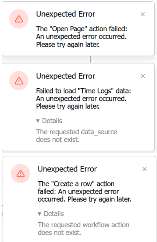 When I clicked submit today, it gave me “unexpected” errors for all three, two of which have expandable “details” available. For the create a row event, it says “the requested workflow action doesn’t exist.” For the refresh data event, it says “the requested data_source does not exist.” (Side note: the errors that pop up disappear very quickly, so I had to resubmit the form multiple times to be able to expand them and screenshot them.)