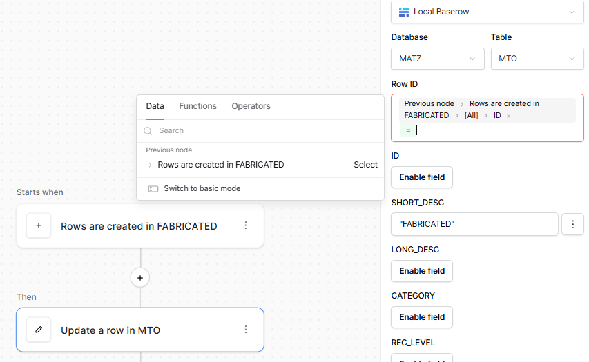 HMMM….IN BASEROW.IO AND TRIED A PROMPT TO BUILD THE AUTOMATION - HERE IS WHAT I GOT AFTER ASKING KUMAR “It isn’t possible to create the requested automation with the current Baserow automation tools because they can only update one row at a time and lack an iterator for bulk updates. You would need to use an external script or API call to loop over the matching MTO records and update their Short‑Desc field”