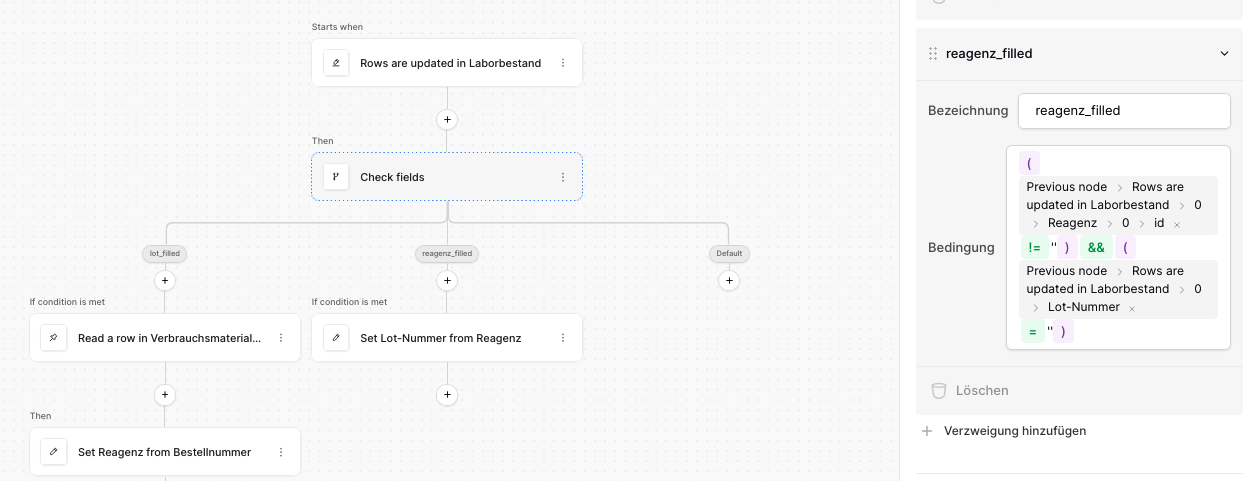 Idea: I want the “reagenz_filled” branch only to be executed, when linked table column “Reagenz” is filled, and text field “Lot-Nummer” is not filled.