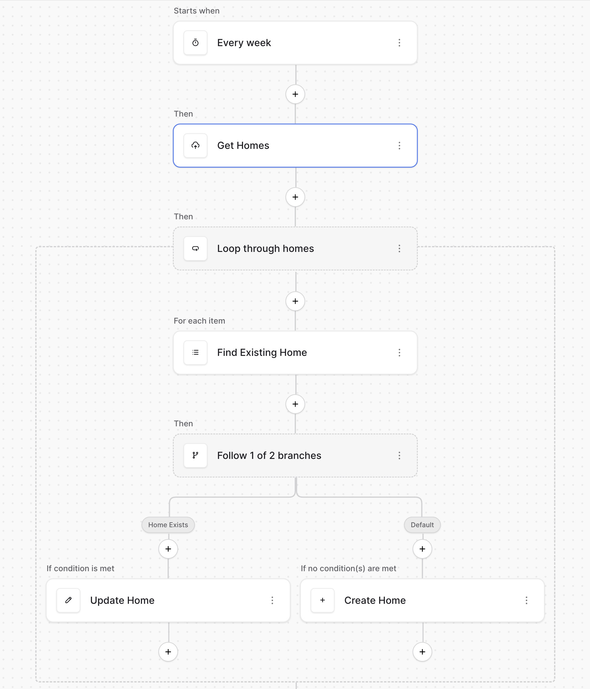I have an endpoint that I am pulling home information from. I want to update the record if it already exists or create the record if it doesn’t. See the logic below.