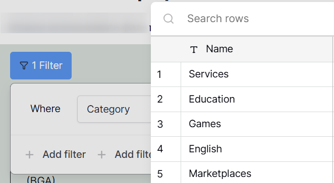 (1) Only search items were marked here. Now I tried to add filters, but they can be selected for all except for Category (2)