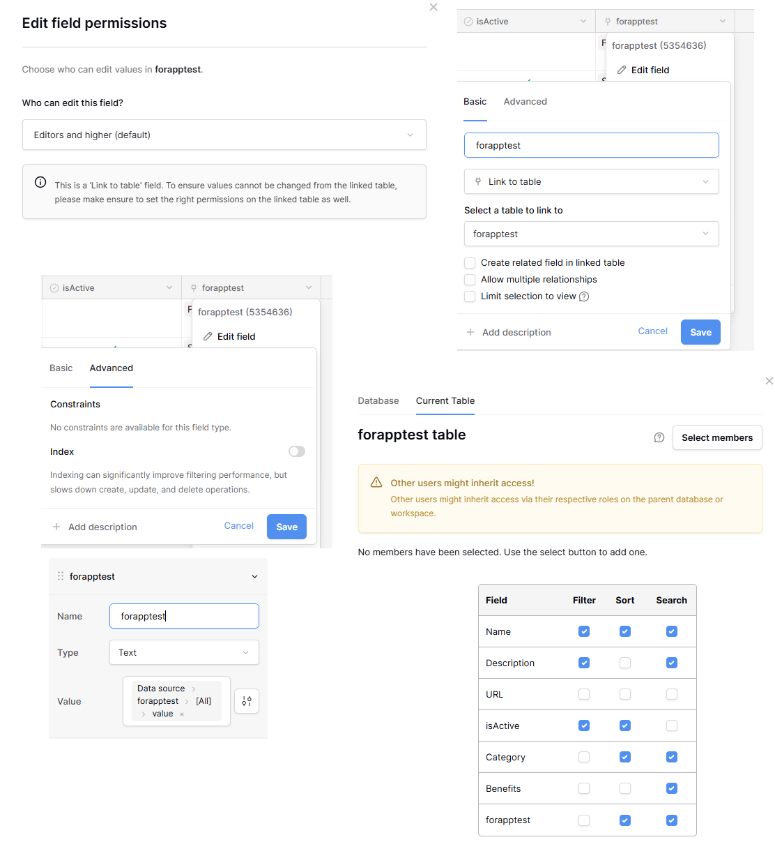 The “link to table” field is, sadly, one of them. What should have happened is that the “Filter” checkbox next to forapptest is disabled, but yours isn’t appearing that way due to a bug.