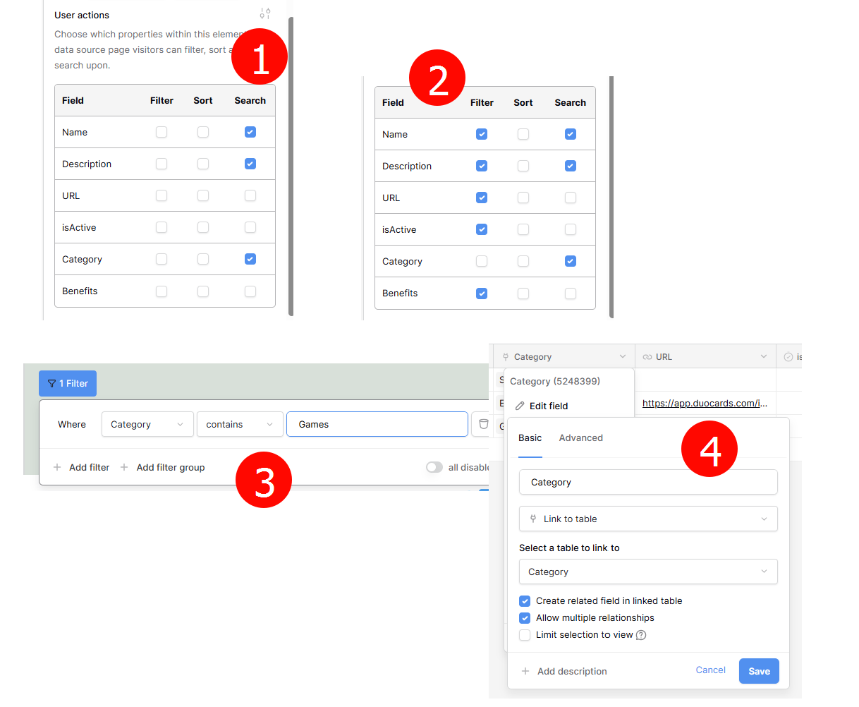 all settings are default. But I can’t choose filter linked fields to filter in app (Category & forapptest - bottom right picture)