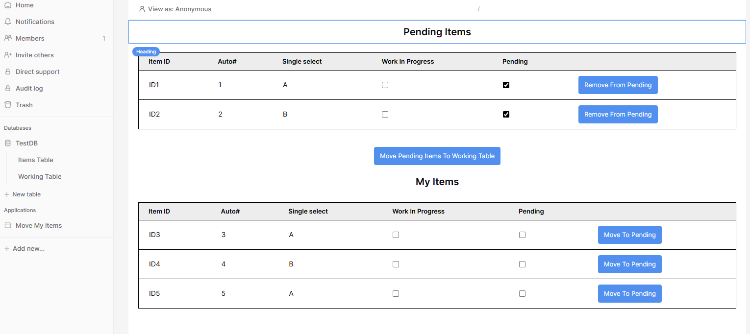 Then they would select the “Move Pending Items to Working Table” button. This button needs to take all the items in the “Pending Items” display-table and copy them from the “Items” database-table to the “Working” database-table. But I cannot find a way to move multiple items. I can only do one item on a single button press.