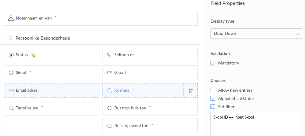 In the child’s add/update form I want to select a school and then select a hostel. The hostel field must display only the hostels linked to the selected school. This is why the heading is a bit vague - are the fields drop-down, lookup or links? I’ve tried them all: Drop-down only allows hard-coded values, lookup displays all the values in the looked-up field and link is used to select the master record.