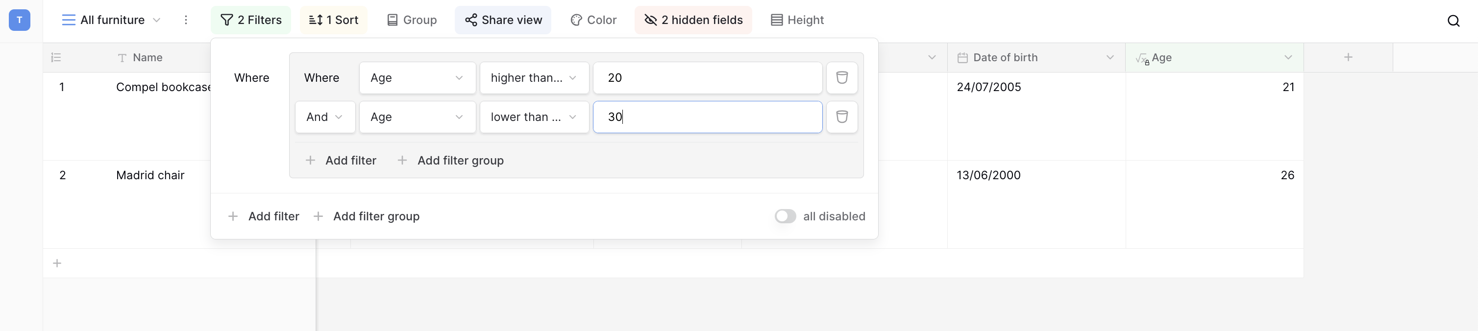 Hey! I discovered yesterday that there’s no option to set filters for fields with formula and lookup types. This functionality is critical as these field types contain a large amount of data. Generally speaking, if there’s a field, in my opinion, it should have full functionality available, including filters and group by. Airtable for example has no such limits.