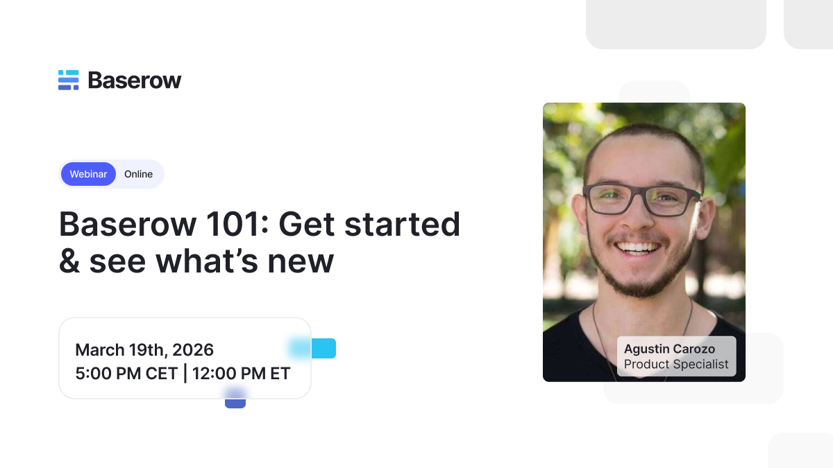 Join our free Baserow 101 webinar on March 19 to learn the fundamentals and see the latest updates in action.