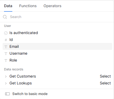 But I assume that fields of type “Record Selector” must be populated by a “Data Source” and can not be populated by a function or formula as you are trying to do.