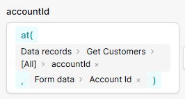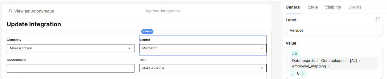 The idea is to use the id from the selection in the ‘Company’ field to get the value (through at()) from the employee_mapping on the same row. Here 0 is just a placeholder, but I was hoping to use Form data > Company, like I’m able to with a text element.