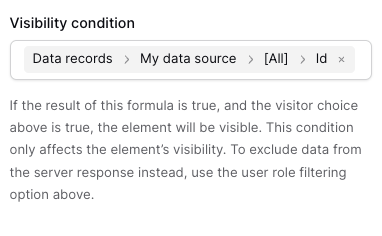 Once this is done, if you swap to your elementās visibility, and apply this formula, it will hide/show the element if your filters returned rows: