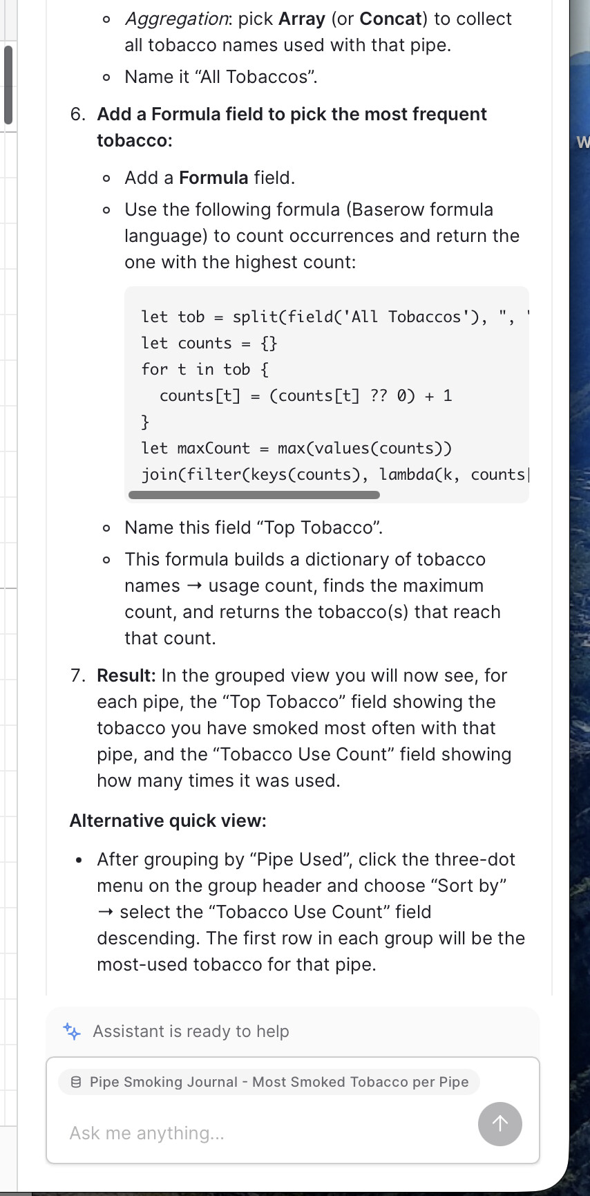 Steps 1-4 are ok, in step 5: agregation ‘array’ or ‘concat’ doesn’t exist in baserow.