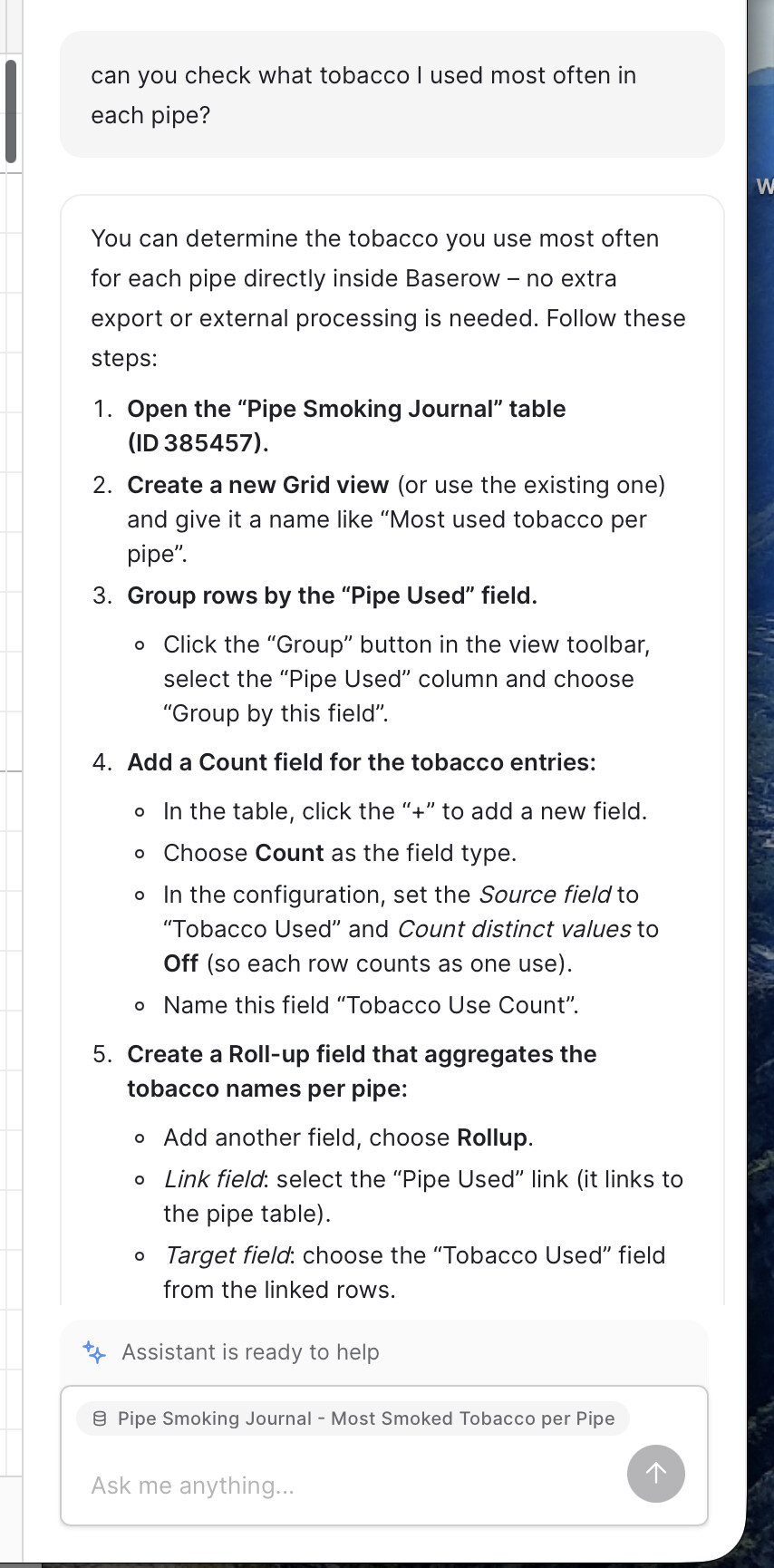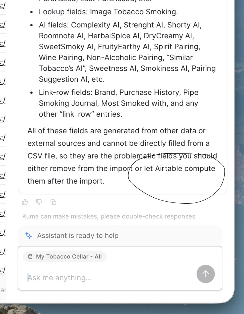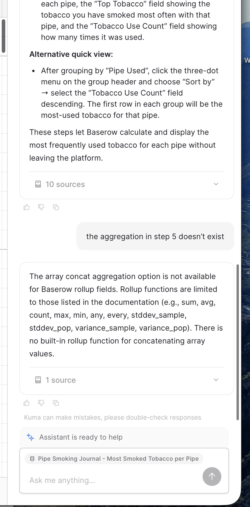 I also included an extra screenshot, that is not relevant to this prompt, but showed that Kuma sometimes seems to refer to Airtable, instead of Baserow.