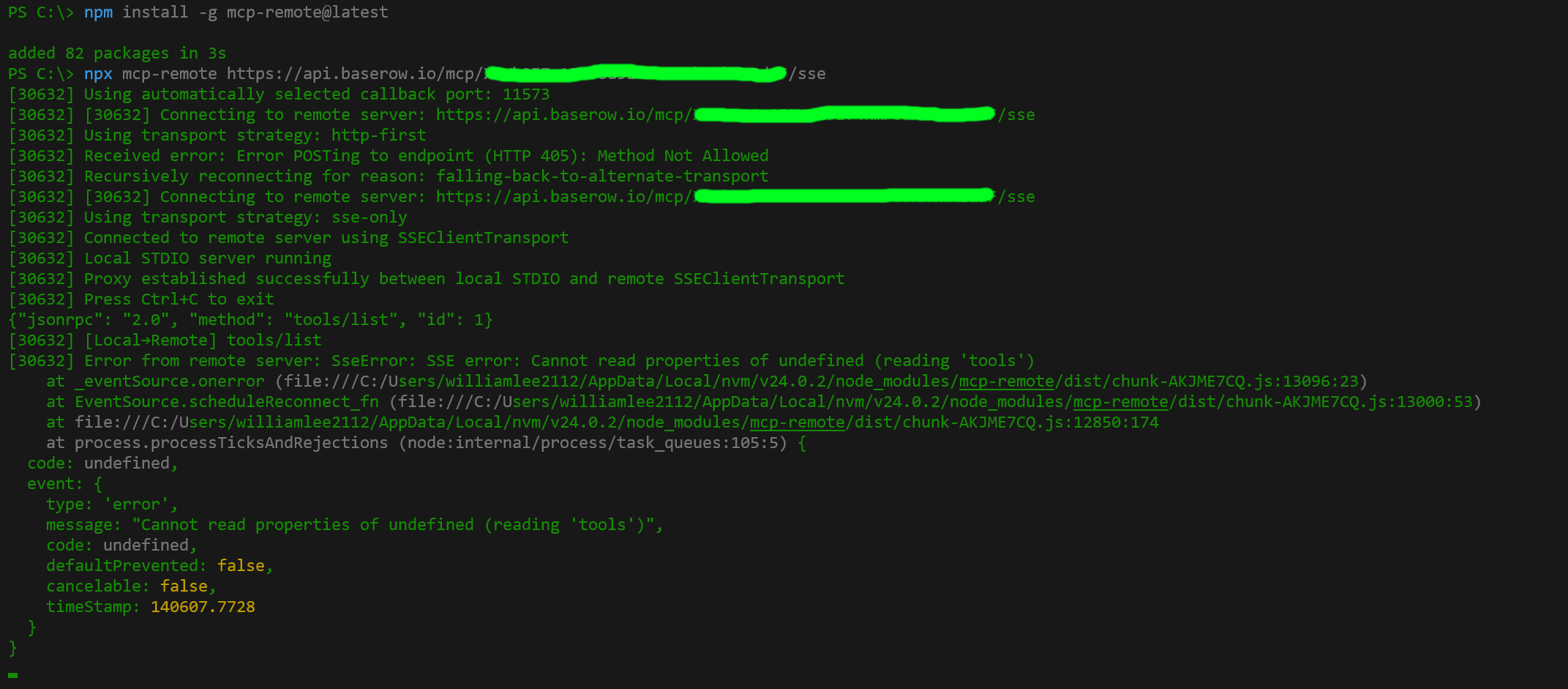 I’m trying to use the Baserow MCP (Model Context Protocol) server with Claude Desktop, but I’m encountering an error that prevents the connection from working properly.