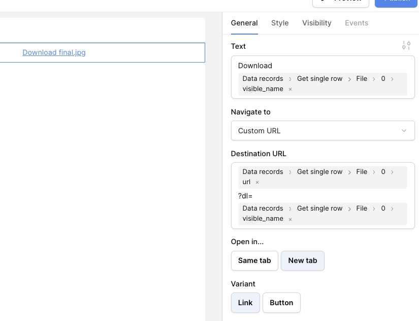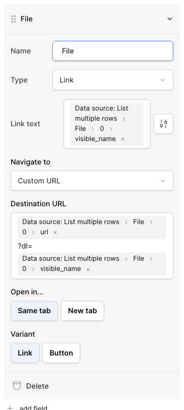 This can be achieved in the application builder with a table element (where the field is of type=link), or a link element, and setting the URL to: url?dl=visible_name.
