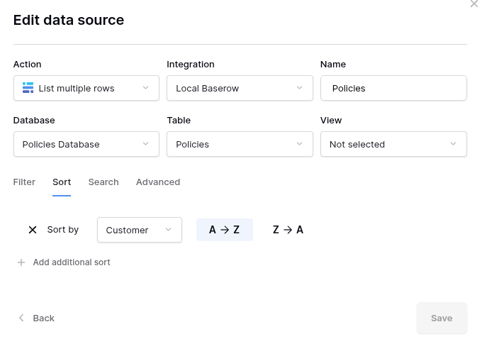 A data source with a view selected and no data source sorting: the rows will be sorted by what has been set up in the database module’s sorting.