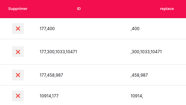 I tried to create an event that updates the cell containing the list of IDs, without including the row ID. Unfortunately, I end up with commas… (see screenshot of the table)