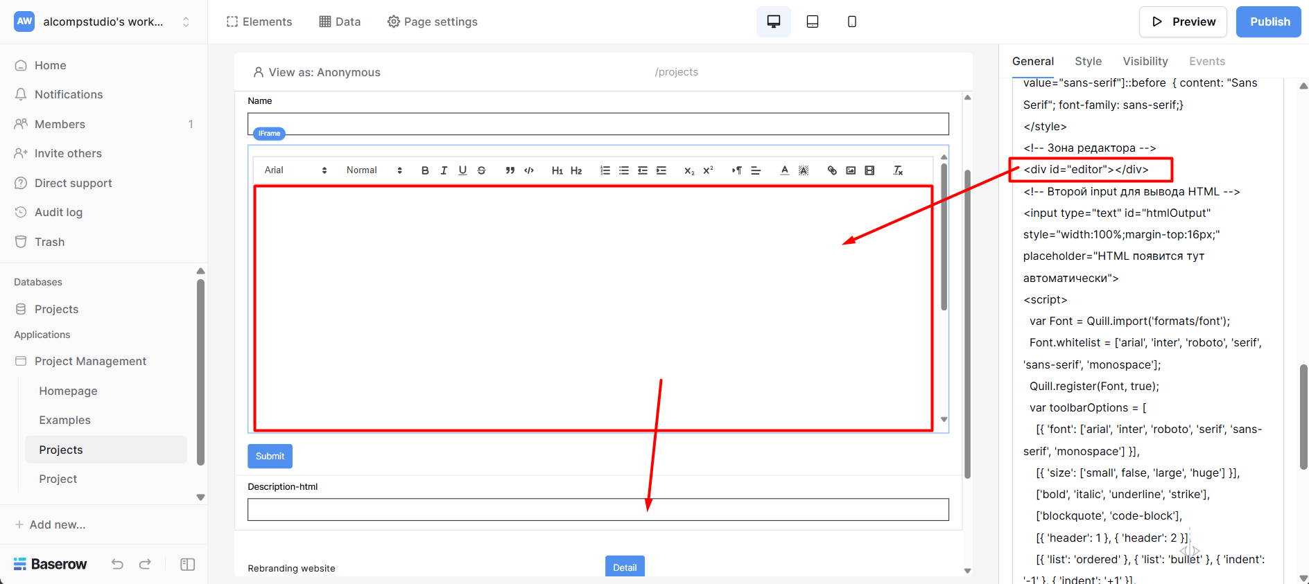 I am new here and discovered this service, which I find very impressive! Especially since it includes a web application builder! I’ve already started building my web application (testing the capabilities of BaseRow), but unfortunately (and to my surprise), I noticed that there is no way to use the Rich Text Editor to add formatted text. I am planning to develop a web application for a copywriting studio, and this input element is very necessary… In the application builder, I noticed that there are only basic input fields (plain text and multi-line text). I desperately tried to integrate external text editors (TinyMCE, Quill) using the iFrame element. I managed to integrate (embed) the Quill editor, but as I expected, I cannot fully use it to write the entered content to the database. I also tried to add a special text field to first copy the text entered in Quill into it and then save it from the text field to the database. But there is no way to automatically and synchronously fill in the field in the Quill text editor so that it is immediately reflected in the input field — this is only possible by copying manually…