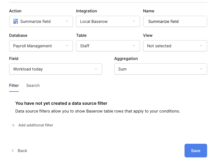 Next, you select the database, table and field you want to see the total from and select Sum as the aggregation function.
