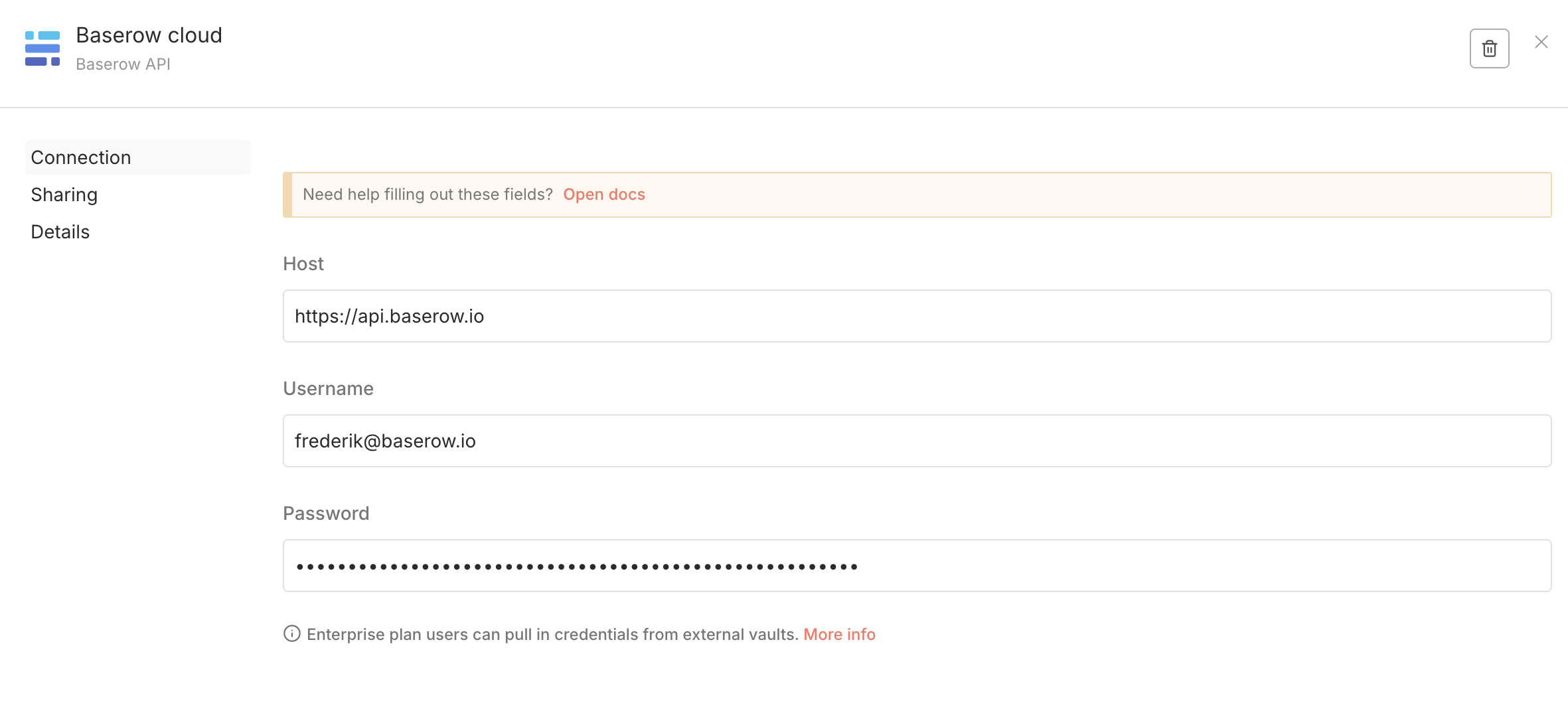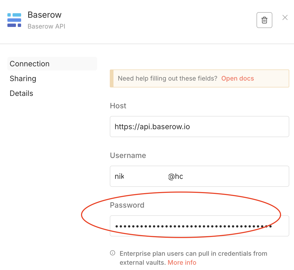 So, the host will indeed be https://api.baserow.io. The Username is the email address you use to sign in into Baserow and the password is your actual Baserow password and not the token.